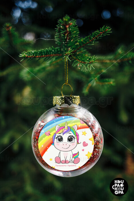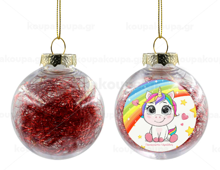 Unicorn baby με όνομα, Transparent Christmas tree ball ornament with red filling 8cm