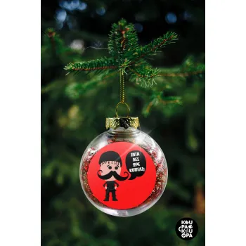 Κρητικός "Ίντα λες ωρέ κοπέλι", Transparent Christmas tree ball ornament with red filling 8cm