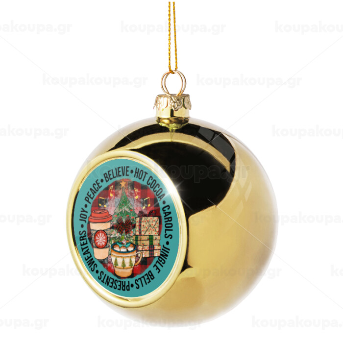 Joy, Peace, Believe, Hot Cocoa, Carols, Golden Christmas tree ball ornament 8cm