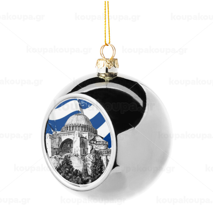 Αγία Σοφιά Ελληνική σημαία, Silver 8cm Christmas tree ball ornament