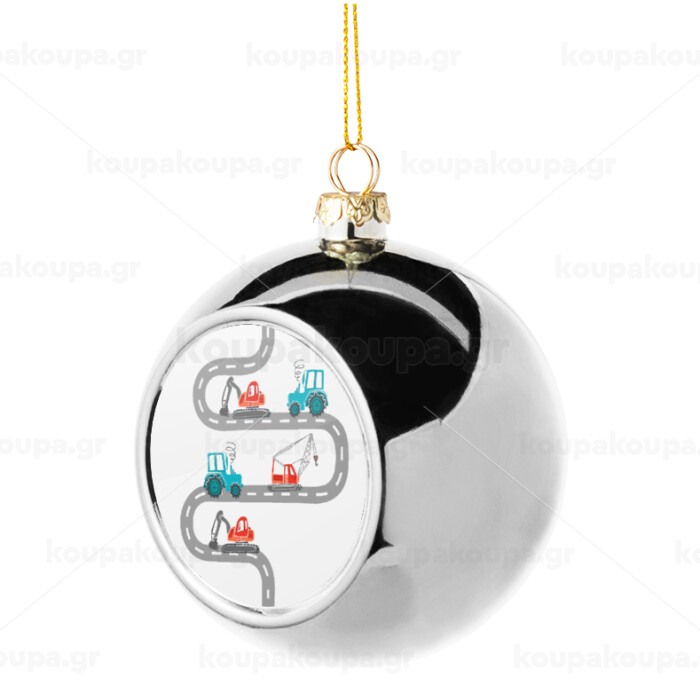 excavator along road, Silver 8cm Christmas tree ball ornament
