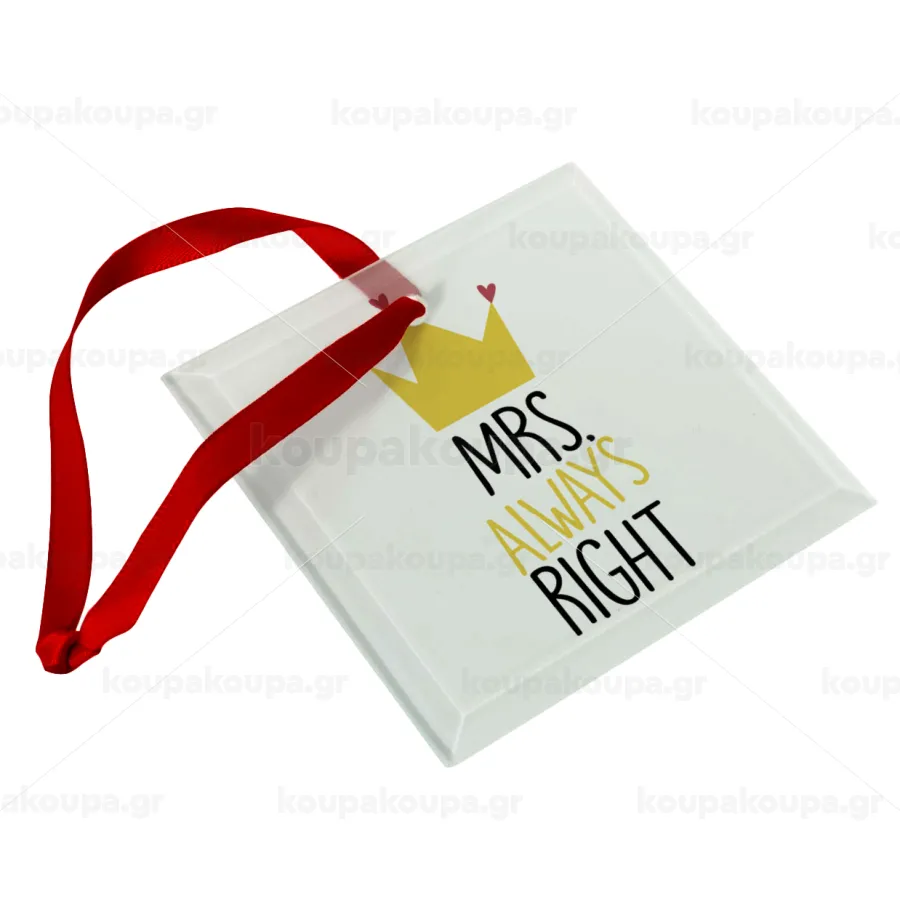 Mrs "Always" right, Christmas ornament, glass square ornament 9x9cm